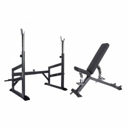 The offer set for effective weight training at home includes a weight bench and a professional barbell rack.